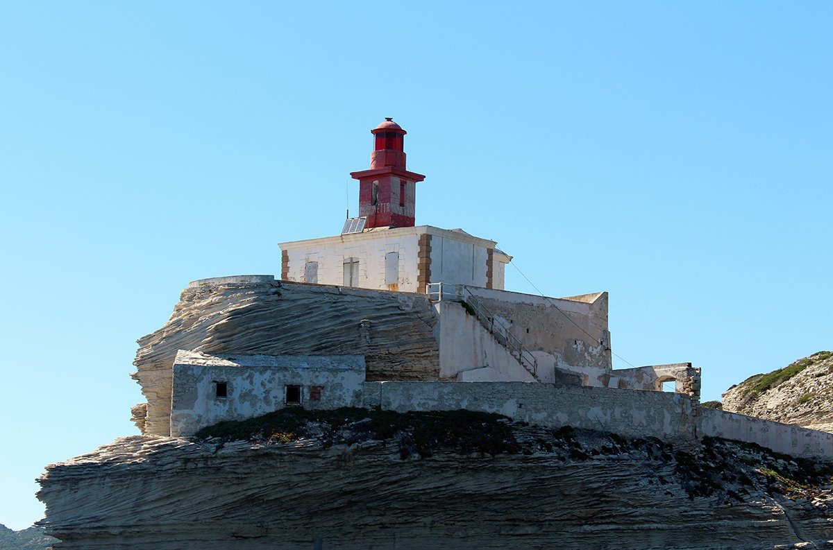 At the entrance to Bonifacio harbour, the Fanale d'A Madonetta is an unused lighthouse that still employs PV panels for remote power, Bonifacio, Corsica.
