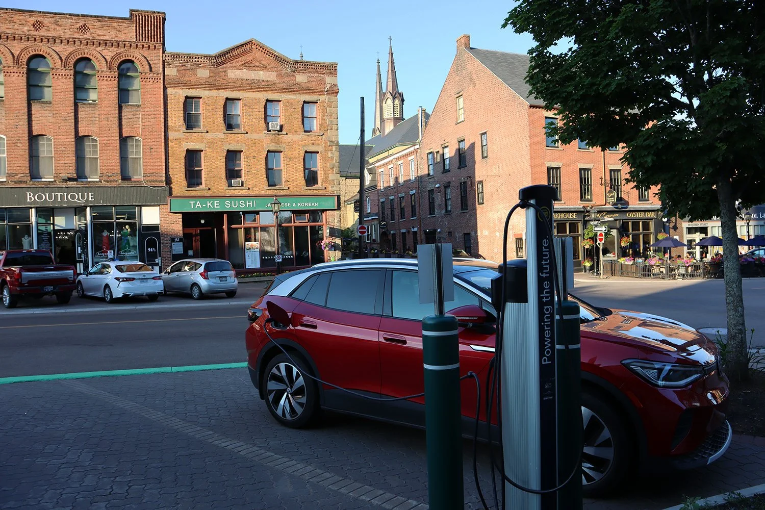 An elective vehicle charging at a public EV charger in Charlottetown, PEI