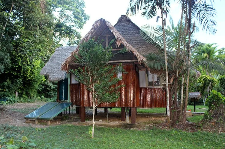 Solar hot water installations in the cabins of the Tambopata River Lodge, Upper Amazon Basin, near Puerto Maldonado, Peru.