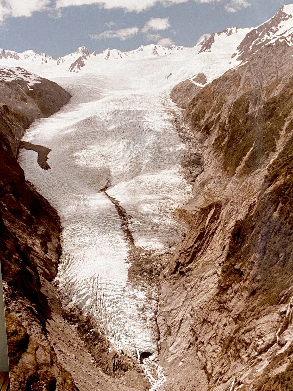 Franz Josef Glacier, photographed from Route 6, South Island, NZ. Warm, humid air masses actually caused significant glacial expansion to the millennium.