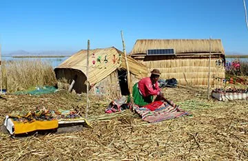 Rooftop PV installation on one of the 70 Uros Islands, made by hand from totora reeds and floating off the shore of Lake Titicaca, near Puno, Peru.