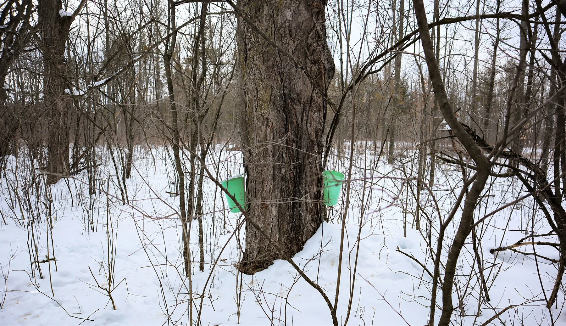 Collecting sap from sugar maples in early spring, Langdon Hall, Cambridge, Ontario